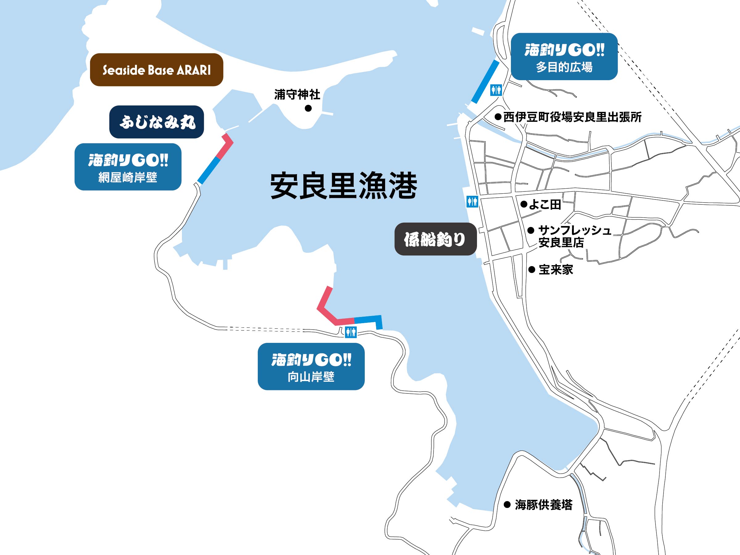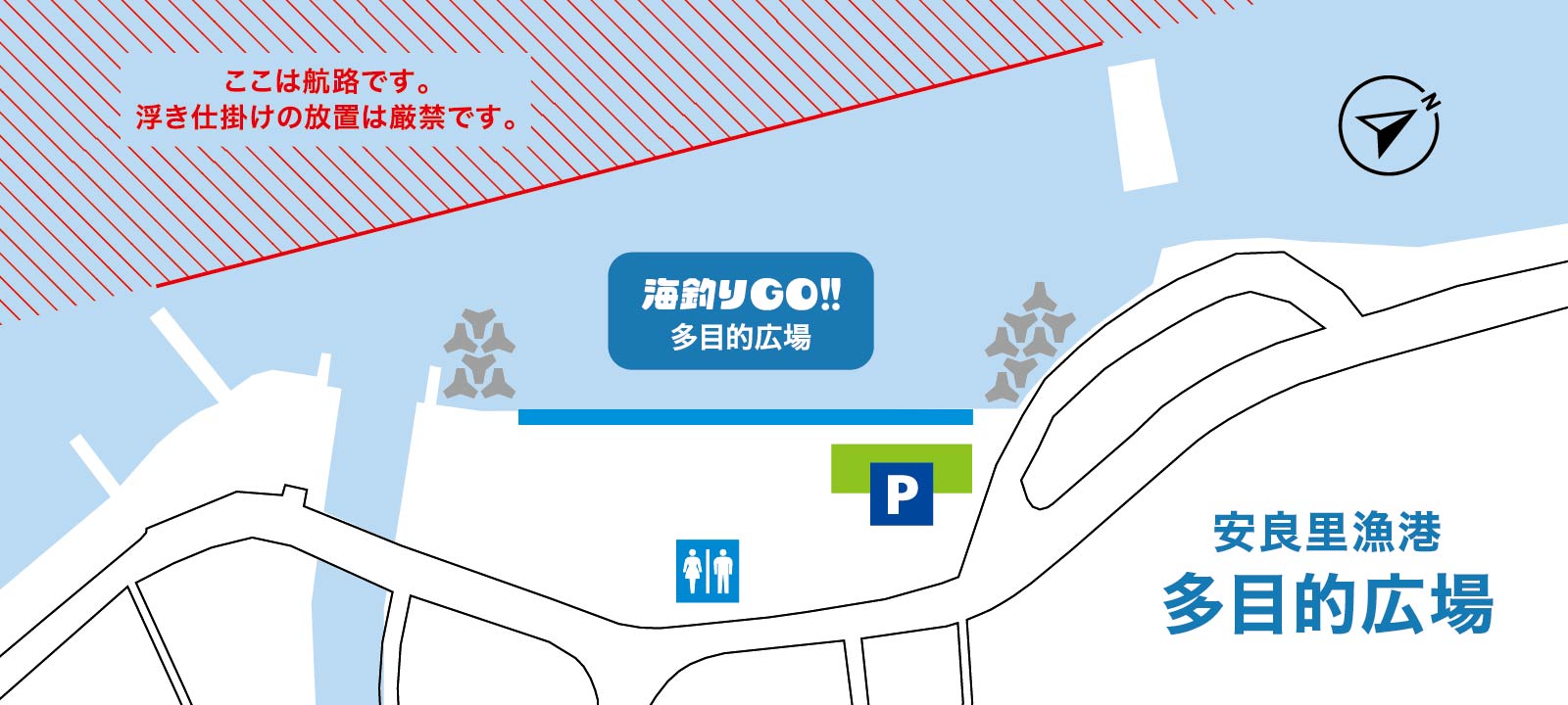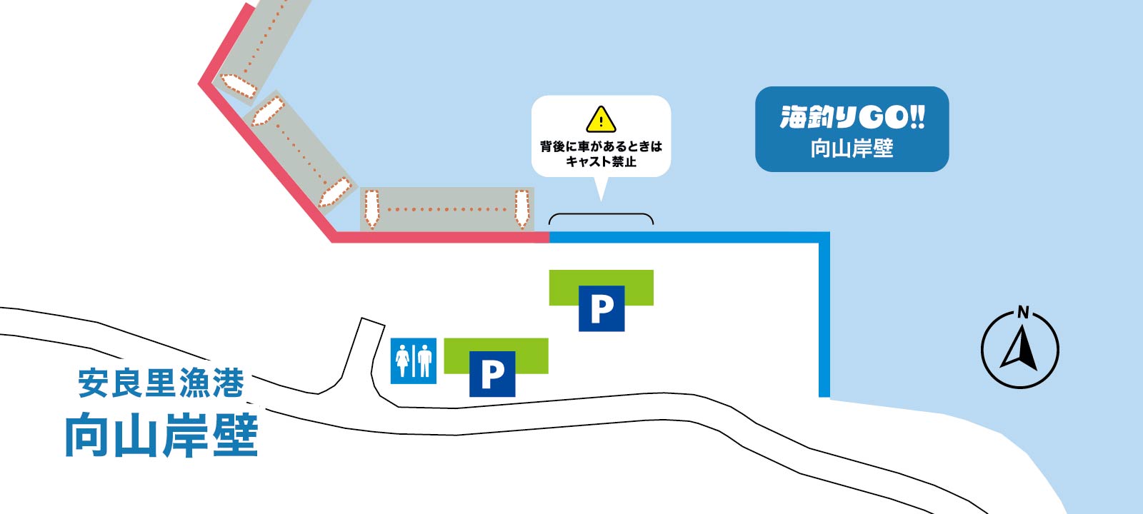 第一期オープンは安良里漁港の向山岸壁と多目的広場が新たな釣り場として開放されます。