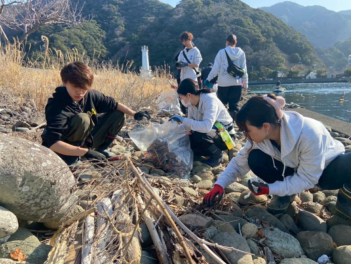 オープン前日の3月1日には、学生ボランティア団体「IVUSA(国際ボランティア学生協会)」の皆様にご協力いただき、22大学103名の大学生による網屋崎岸壁一帯の清掃活動が行われました。地域の皆様や学生ボランティアの力強いサポートにより、釣り場オープンに向けた準備が無事に完了いたしました。